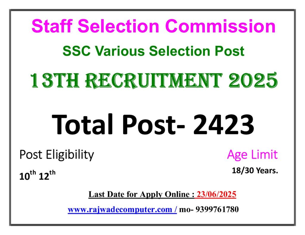 Rajwade Computer की ओर से हम इस लेख में आपको आवेदन प्रक्रिया से लेकर पात्रता, सिलेबस और महत्वपूर्ण तिथियों की पूरी जानकारी देने जा रहे हैं। SSC Selection Post XIII Recruitment 2025 – Complete Details